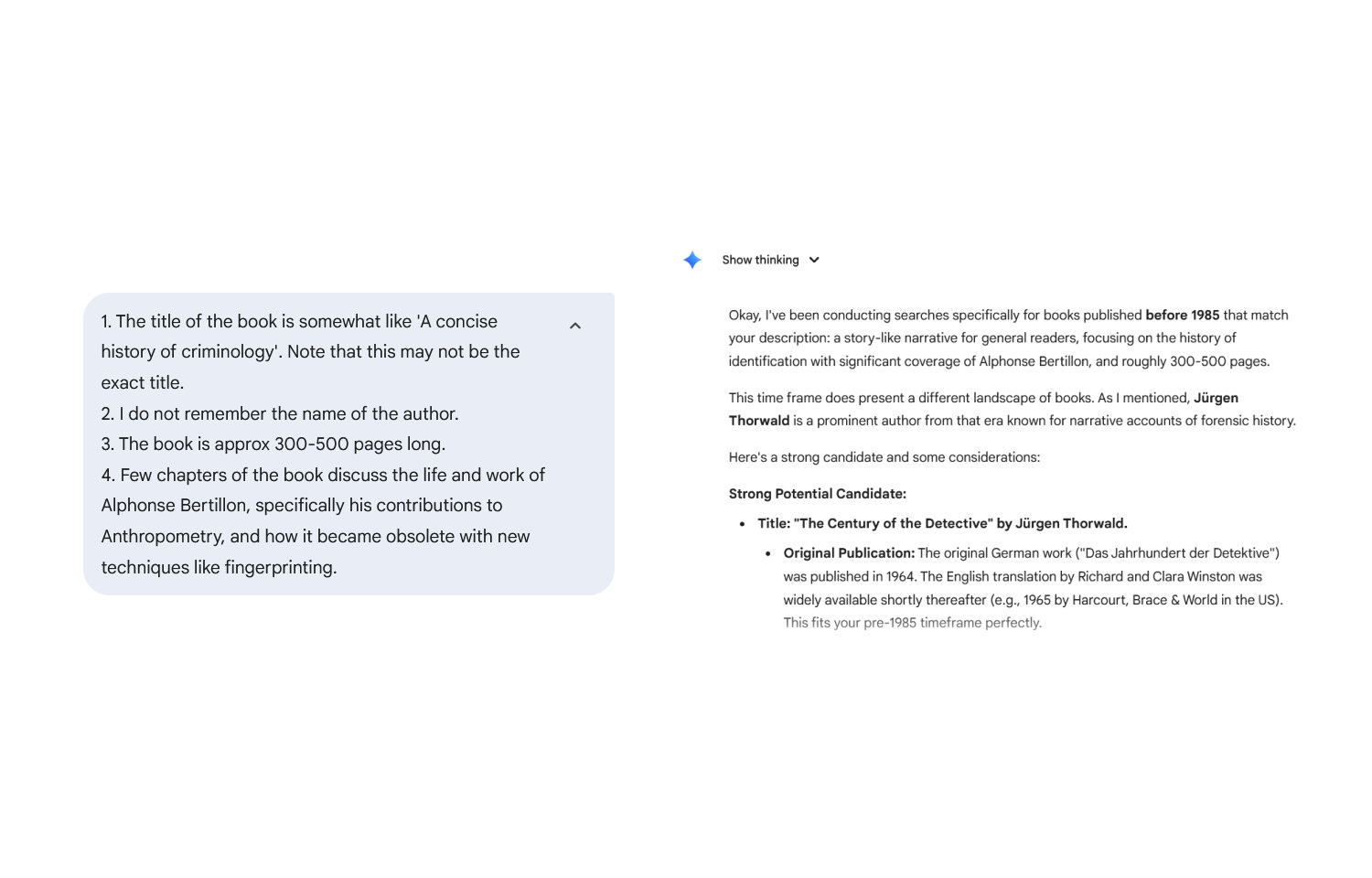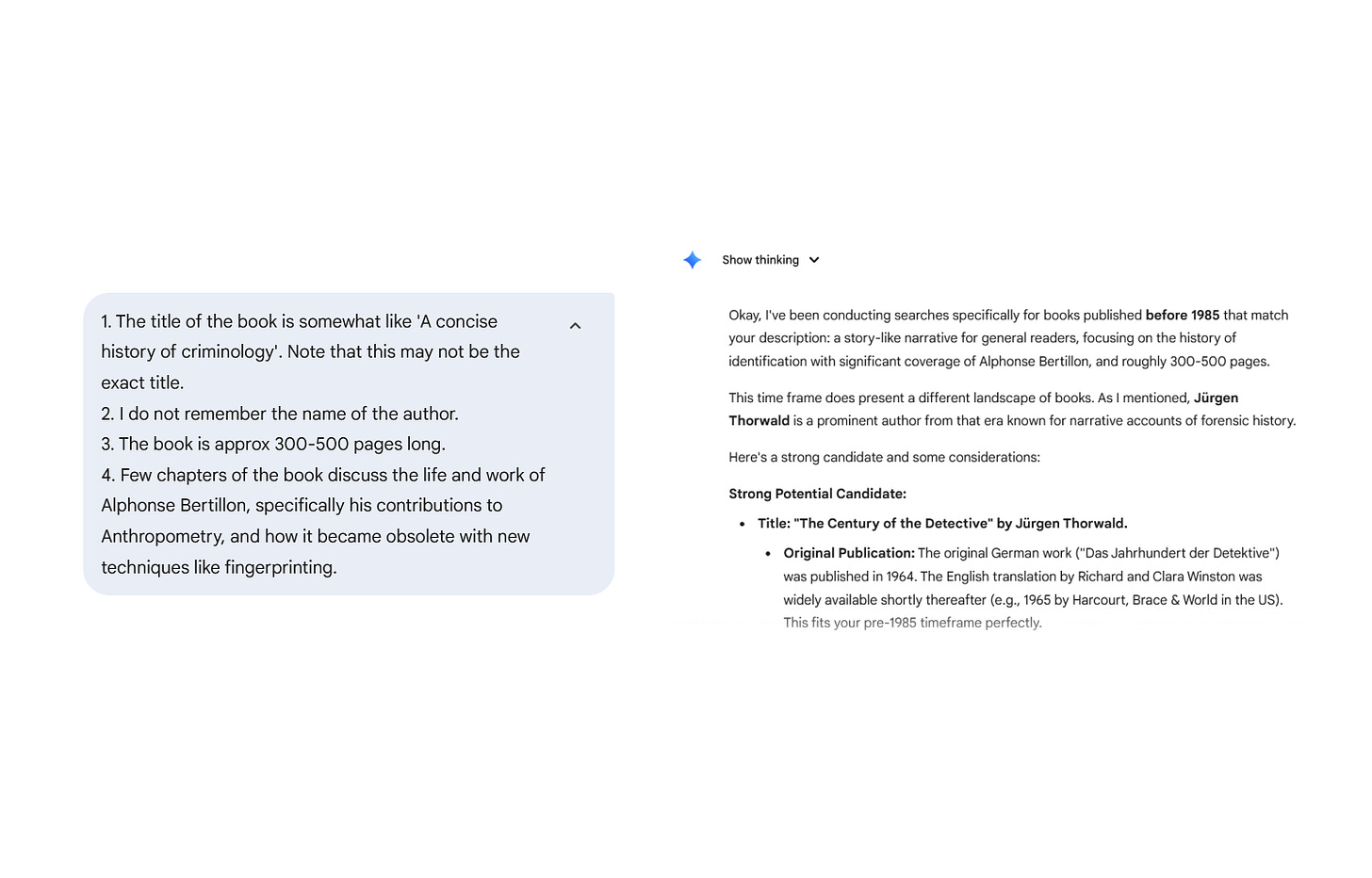 He shared it with an example. Back in school, he read a translated book on the history of crime investigation. He never knew the original title, but the ideas stayed with him. For nearly fifteen years, he kept searching for the book, which became almost routine. Recently, using Gemini, it finally led somewhere. The book turned out to be from the 1960s, not available as an ebook, only as a scanned PDF.